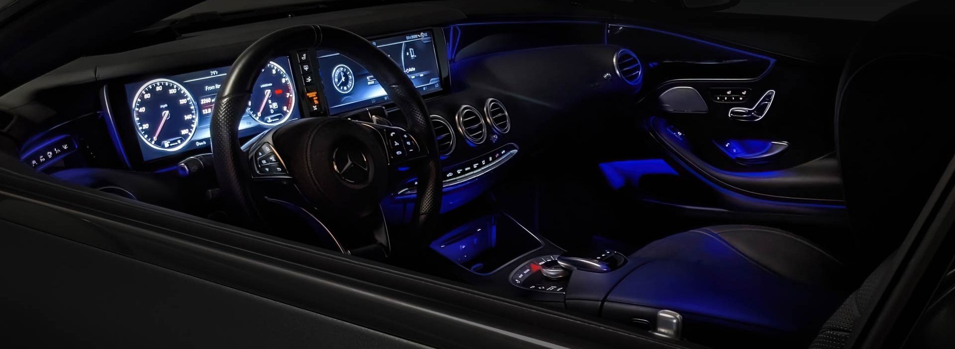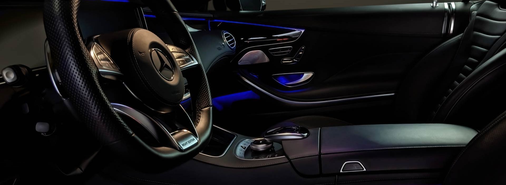 The door sills are illuminated with the “Mercedes-Benz” lettering and seats upholstered in nappa leather in black/black look.